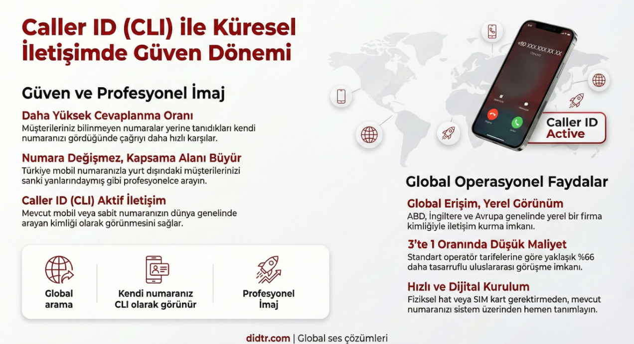 Globalleşen iş dünyasında müşteriye ulaşmak artık sadece arama yapmak değil, doğru numara ile aramak anlamına geliyor. Arayan numaranın tanıdık ve güvenilir olması, çağrının açılma ihtimalini doğrudan etkiliyor. İşte tam bu noktada Caller ID (CLI) hizmeti devreye giriyor. Caller ID (CLI) Nedir? Caller ID (CLI – Calling Line Identification), yaptığınız aramalarda karşı tarafın telefonunda sizin numaranızın […]