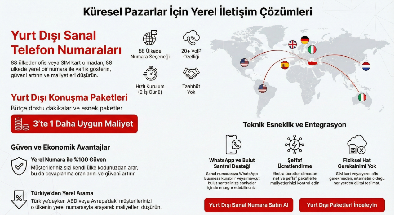 Günümüzde yurt dışına satış yapmak, sadece web sitenizin farklı dillerde olmasıyla yeterli değil. Müşterilerinizle yerel bir firma gibi iletişim kurabilmeniz, güven oluşturmanın ve satış dönüşümünü artırmanın en önemli adımlarından biri hâline geldi. DIDTR olarak sunduğumuz Yurt Dışı Sanal Telefon Numaraları ve Yurt Dışı Konuşma Paketleri ile işletmenizi global pazarlara taşırken, müşterilerinizle yerel bir deneyim sunmanızı […]